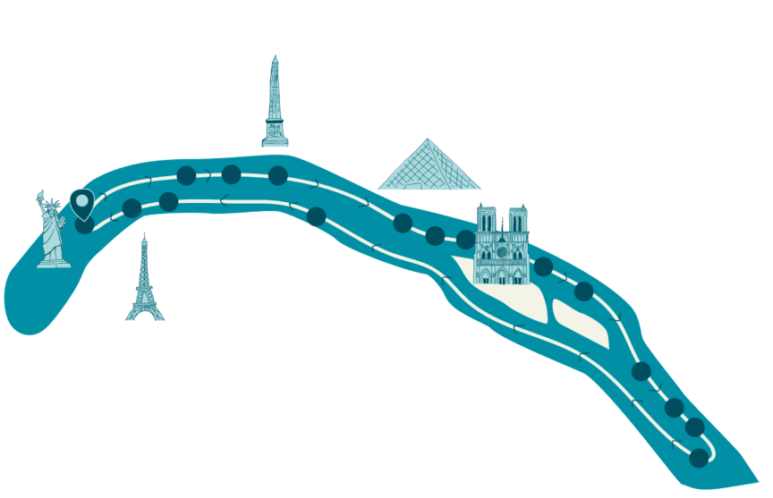 L’embarquement s’effectue sur l’île aux Cygnes, au niveau du pont de Bir-Hakeim, dans le 15ᵉ arrondissement. L’accès est possible à pied, en métro, RER, bus ou voiture.