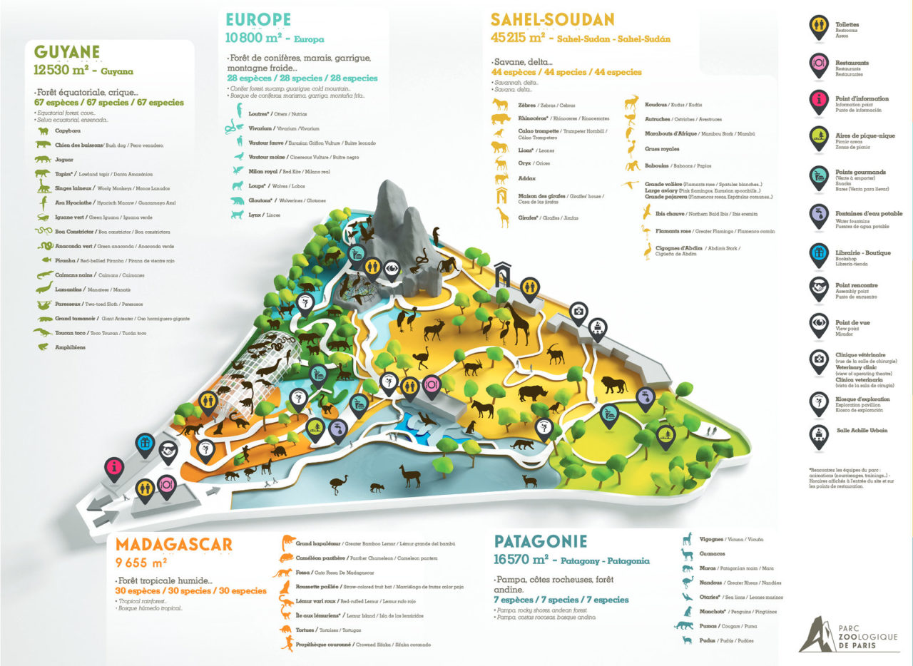 Le zoo de Vincennes est divisé en 5 biozones. Ces écosystèmes permettent aux animaux d’évoluer dans un environnement qui leur est familier. Chaque biozone représente un écosystème riche et particulier de la planète.