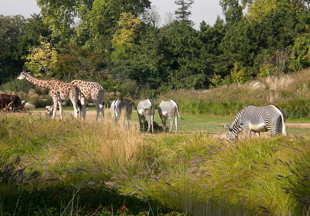 C’est la signature du parc. À bord de votre voiture, vous traversez deux continents en une heure de voyage : l’Afrique d’abord, où les girafes, rhinocéros et zèbres évoluent au pied d’un village africain, puis les grandes forêts nord-américaines où ours noirs et bisons se promènent en totale liberté sur treize hectares.
